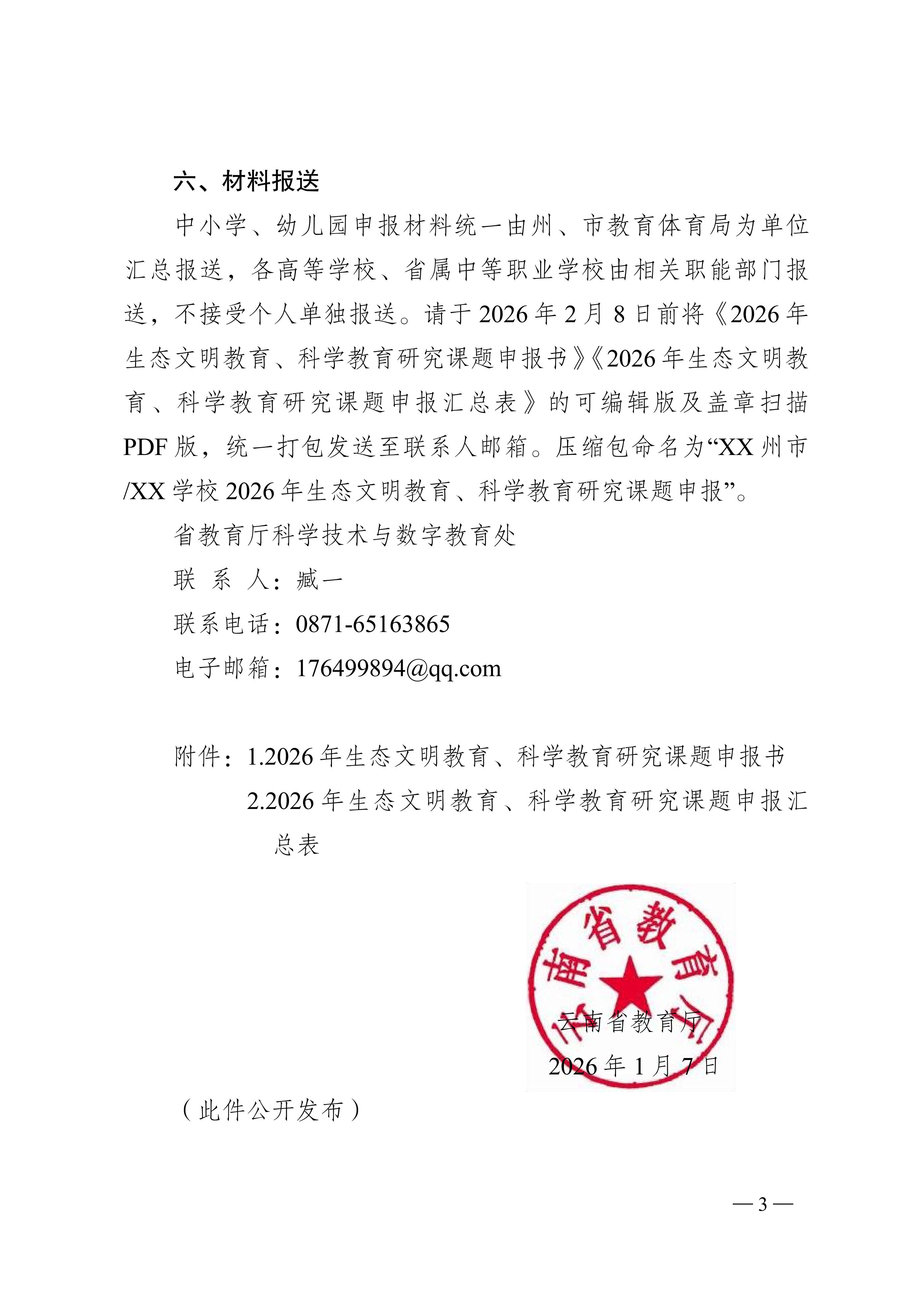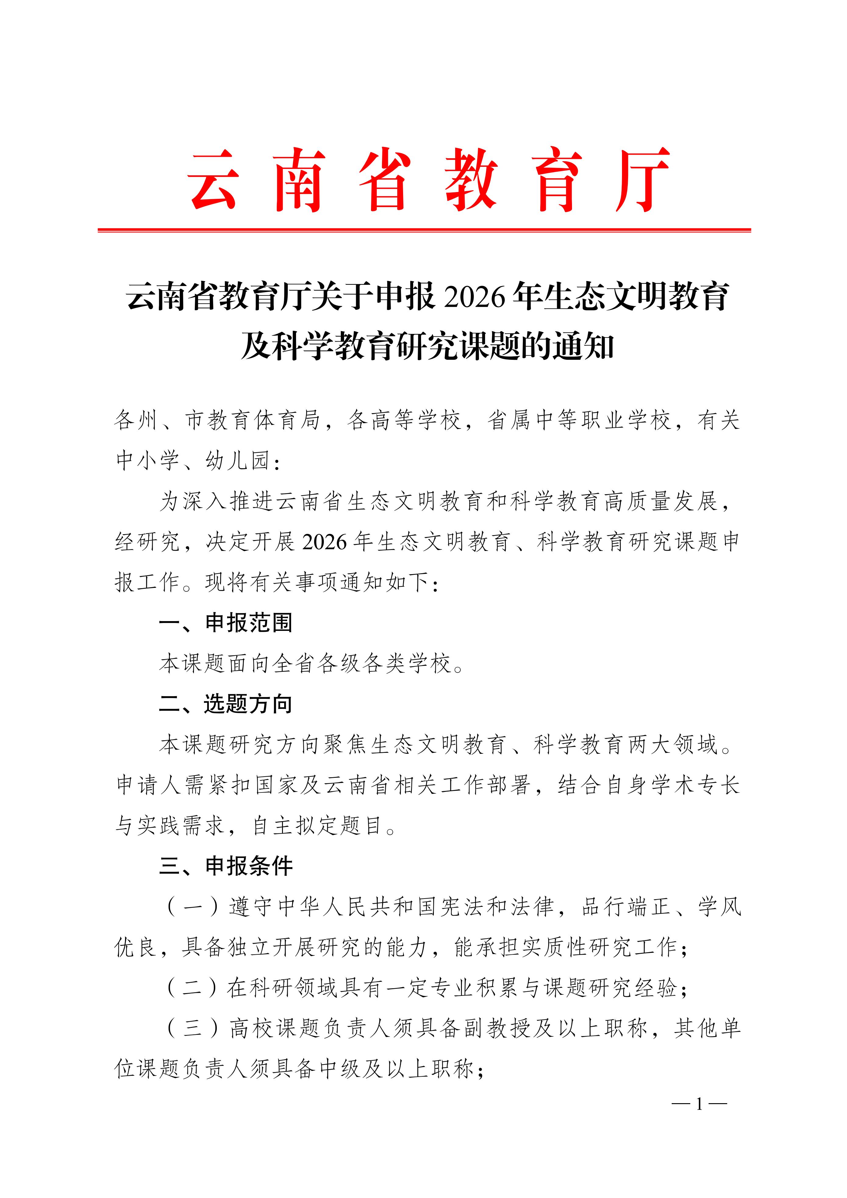 云南省教育厅关于申报2026年生态文明教育及科学教育研究课题的通知