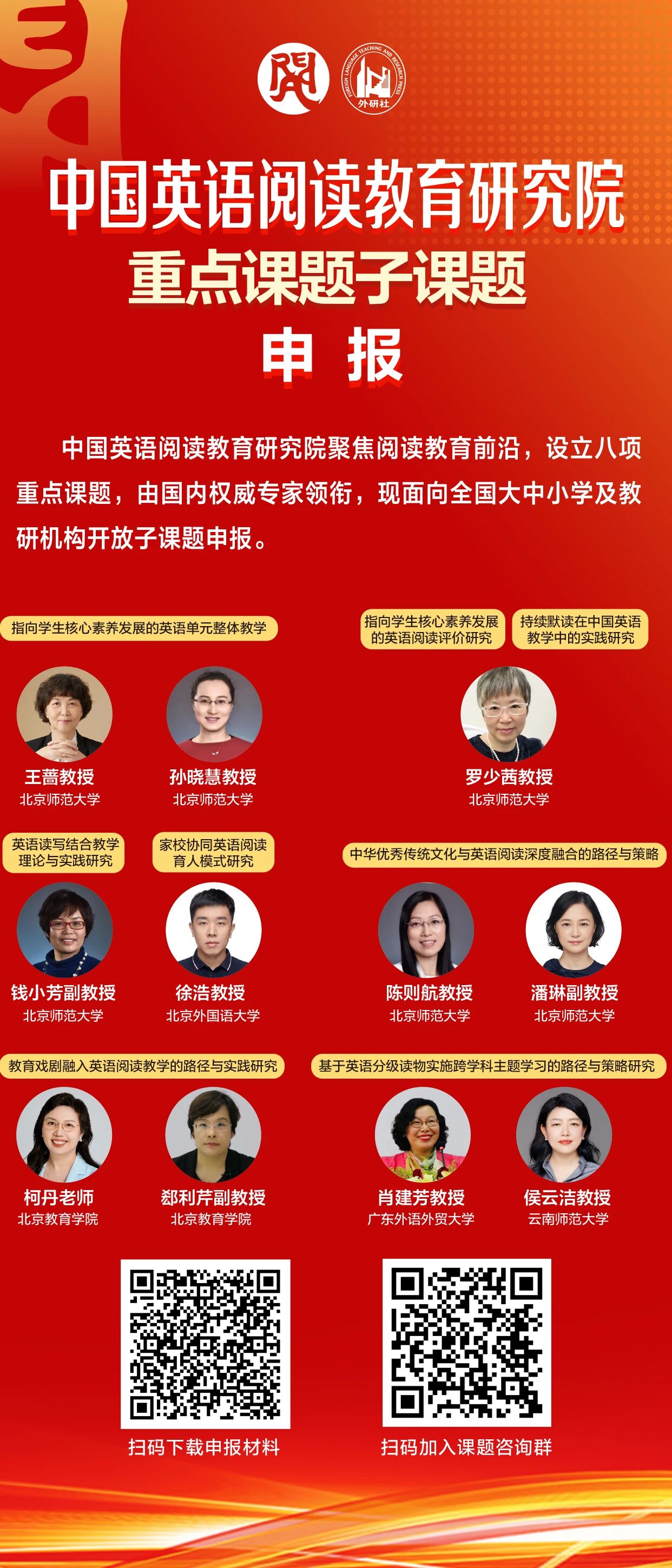 为深入贯彻全民阅读战略,落实立德树人根本任务,中国英语阅读教育研究院现启动2026年度重点课题子课题申报工作。本次申报依托中阅院已设立的八项重点课题,面向全国中小学、高校外语教师及教研机构研究人员开放子课题申报。