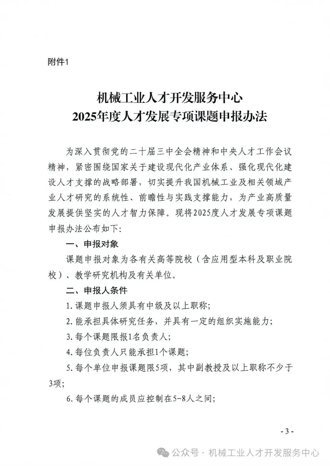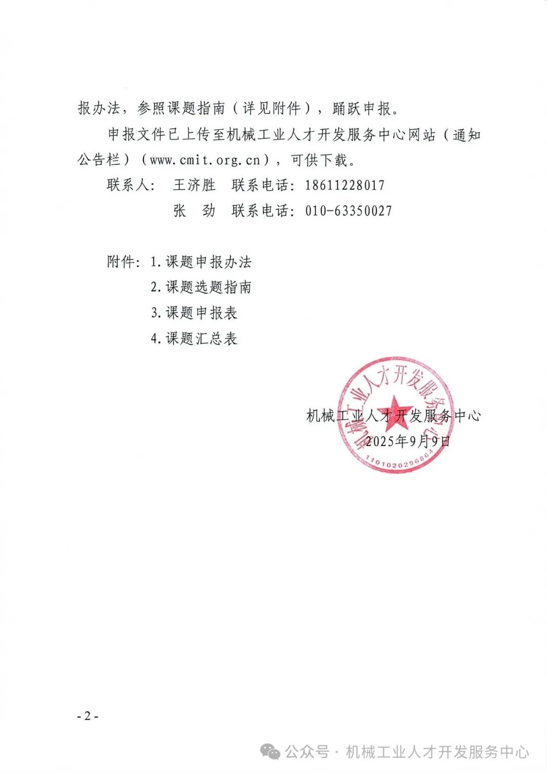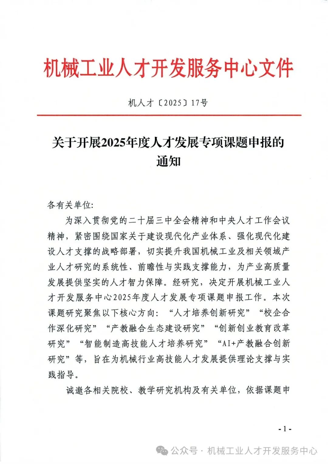 机械工业人才开发服务中心关于开展2025年度人才发展专项课题申报的通知