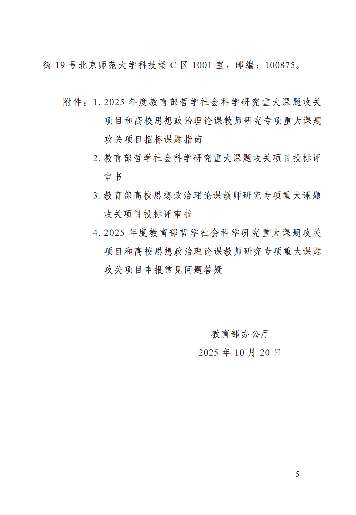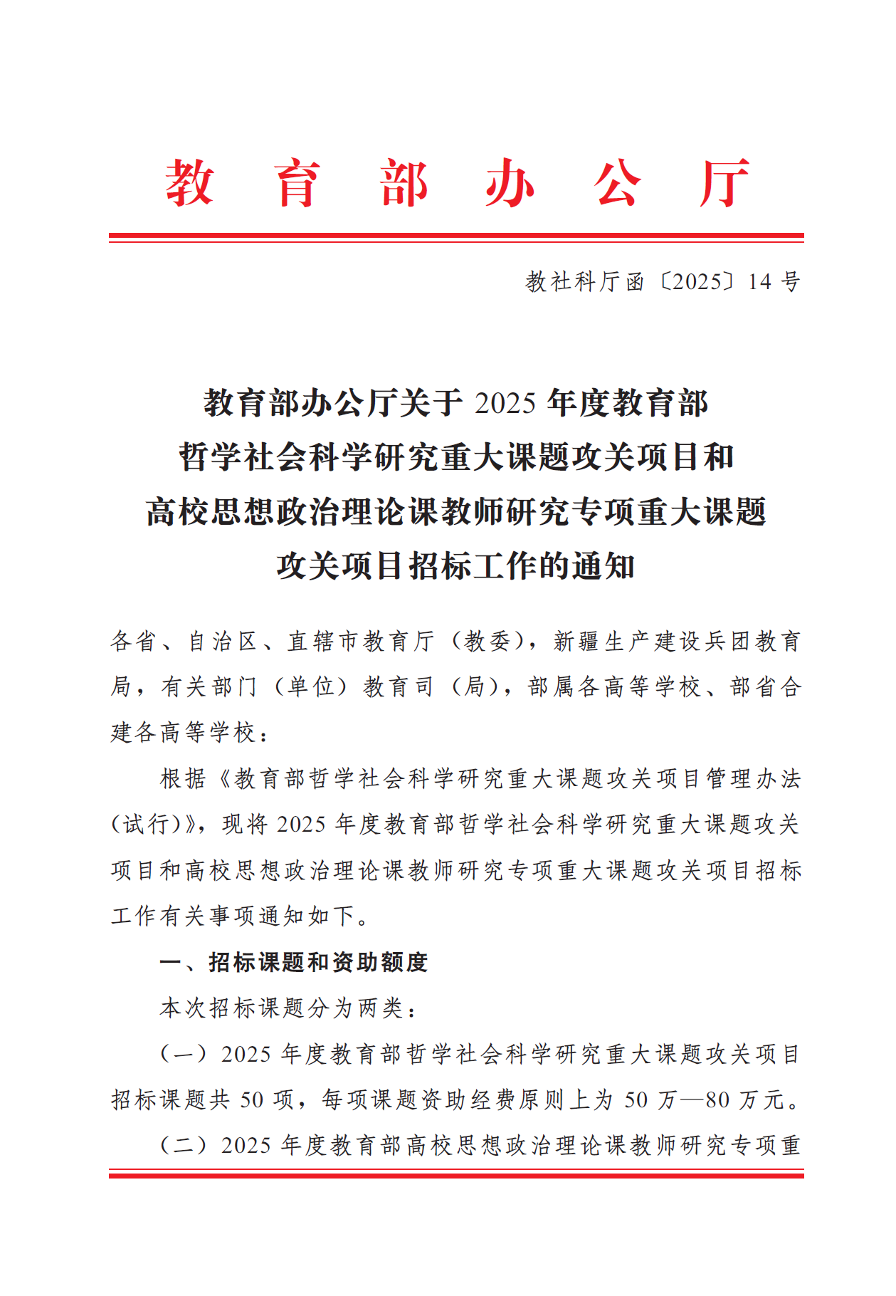 附件:教育部办公厅关于2025年度教育部哲学社会科学研究重大课题攻关项目和高校思想政治理论课教师研究专项重大课题攻关项目招标工作的通知(教社科厅函〔2025〕14号).pdf