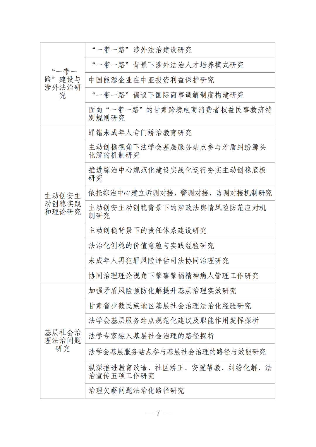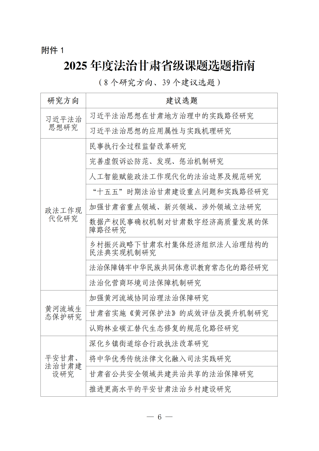 经省委政法委、省委依法治省办、省教育厅、省人社厅、省法学会共同研究,现将《2025年度法治甘肃省级课题选题指南》及课题申请、备案、报送、审核、奖励等有关事项公告如下: